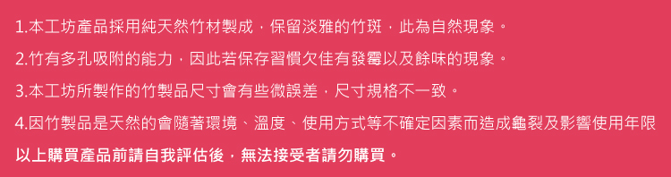 竹子的硬度高於一般我們所常熟知的樹種,正常使用的話是不容易裂,不建議重壓及重摔